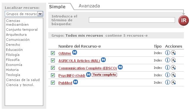 La Metabúsqueda es una búsqueda simultánea en varios recursos-e. La consulta es lanzada a cada recurso-e, y los resultados obtenidos se muestran en una lista combinada, ordenada según el rango de relevancia e indicando si alguno de los resultados está duplicado. También se puede escoger ver los resultados de un recurso-e en concreto.